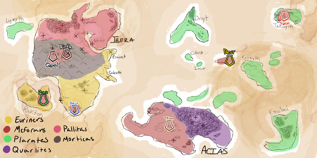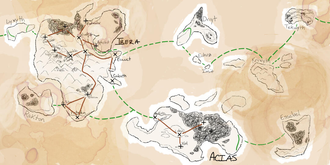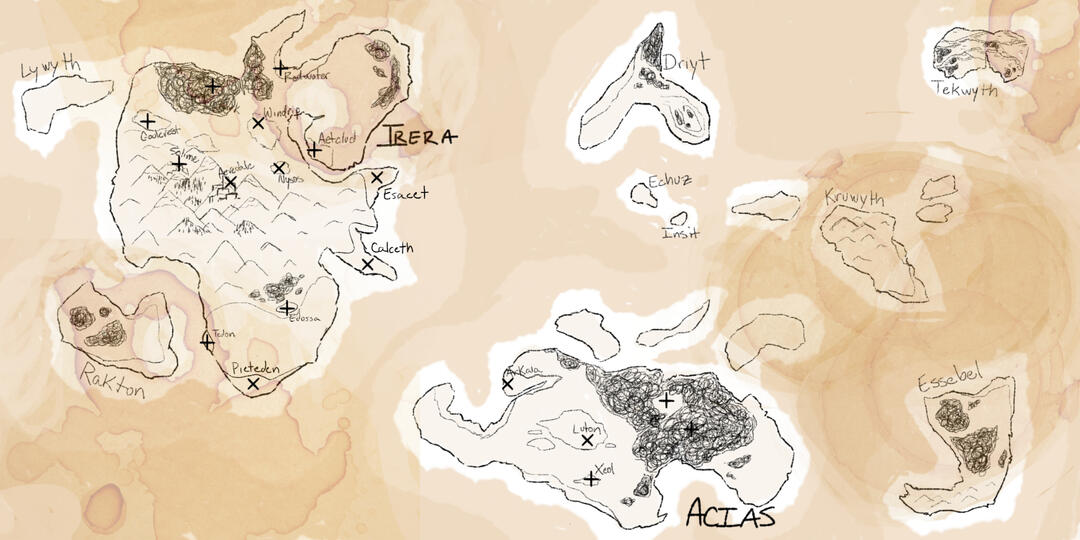 Acias is a much less cohesive continent than Irera. Cities and towns in Acias all have their own laws and governments without regions like Northern Irera. It’s also much less sparsely populated, with people mostly clustering in hot-spots that already exist like Luton and Arkala.Acias has no true government. Any laws or rules are entirely town-specific, and people who are wanted in one town will most likely be unkown in another town. The only city that has any kind of far reach is Luton, the capital of the continent.Arkala is a major port city of Acias. It’s primary business is trade and ship making. Whenever people travel to the continent of Acias, most of the time they will first arrive in Arkala. The city of Arkala spans a large portion of Acias’ eastern coastline and acts as a launch point for many trading trips.Luton could be considered the capital city of Acias. It is not a port city, but it is the largest and most sprawling city Acias has. It’s huge, spanning many miles of land. It primarily does magical research and very minor scientific research. The Meforan shrine of Tfon is located in this city.Ecrin acts as a centralized location for many criminals. It is located deep within the Nepone forest, and is incredibly difficult to reach without assistance from someone familiar with the area. There is little to no government in this town, but it is not violent and chaotic as one may expect. People of Ecrin tend to stay to themselves out of suspicion.Xeol is a town where everyone knows each other. It usually receives metals and enbrem all the way from Colrik and Solime. Many well-known prosthetics engineers lived in and learned in Xeol.Chid is a location not marked on most common maps. It’s incredibly secretive, with the community primarily composing of various trokai that have exited the labs in the Nepone forest. Some explorers may try to find the city from second-hand stories and fables passed around by superstitious adventurers.