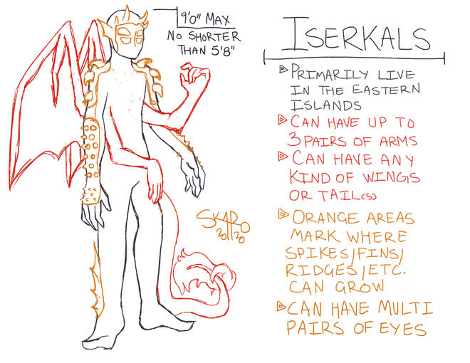 Iserkals are an incredibly tall and lanky race that inhabits the islands. They can stand up to 9’ tall, with strangely flexible torsos and multiple limbs. They primarily inhabit Driyt and its lesser islands. Their clothes are light and flowing, for easy movement and so they don’t sweat themselves to death.